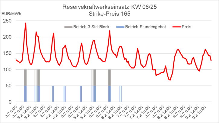 Die folgende Abbildung 1 zeigt exemplarisch für den Preisverlauf in KW 6/2025, wie bei einem Strike-Preis von 150 EUR zwei Reservekraftwerke produziert hätten, wenn eines davon alle Stunden einzeln (blau) und das andere nur für zusammenhängende Perioden von wenigstens 3 Stunden (grau) geboten hätten (die Säulenhöhen haben symbolischen Charakter und dienen nur der Kennzeichnung der relevanten Stunden).