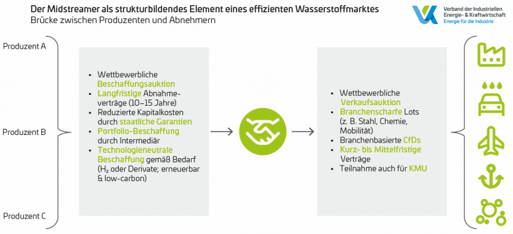 Vor diesem Hintergrund schlägt der VIK die Etablierung von dezidierten Wasserstoff-Midstreamern als Intermediäre und zeitgleich als zentralem Fördermechanismus für den Wasserstoffmarkthochlauf vor.